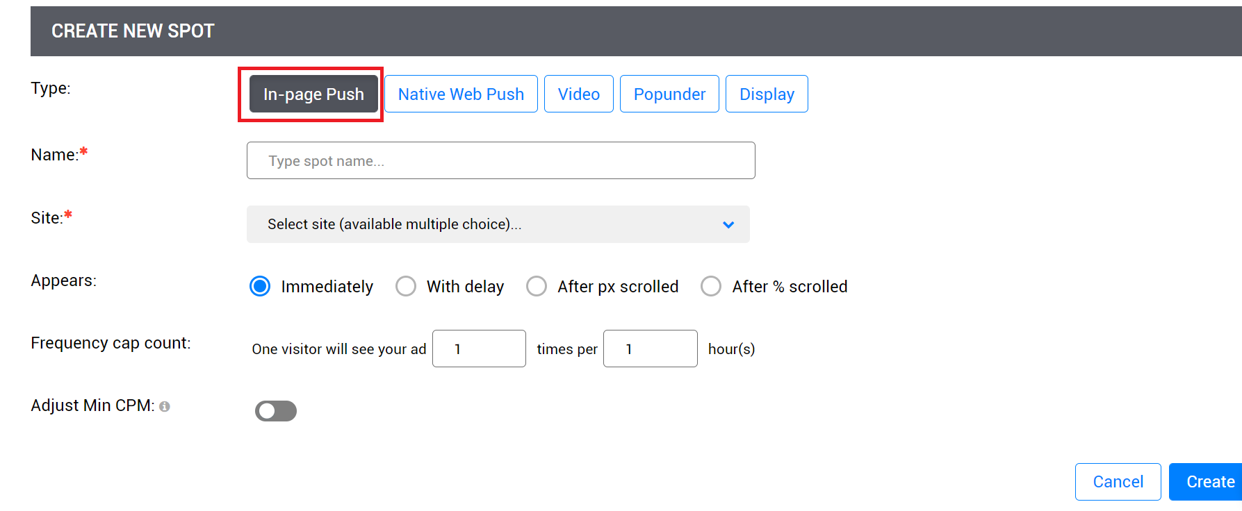 Go the Spots page, press the button “Add Spot“.On the new page select the In-page Push Spot type and configure it as you need.