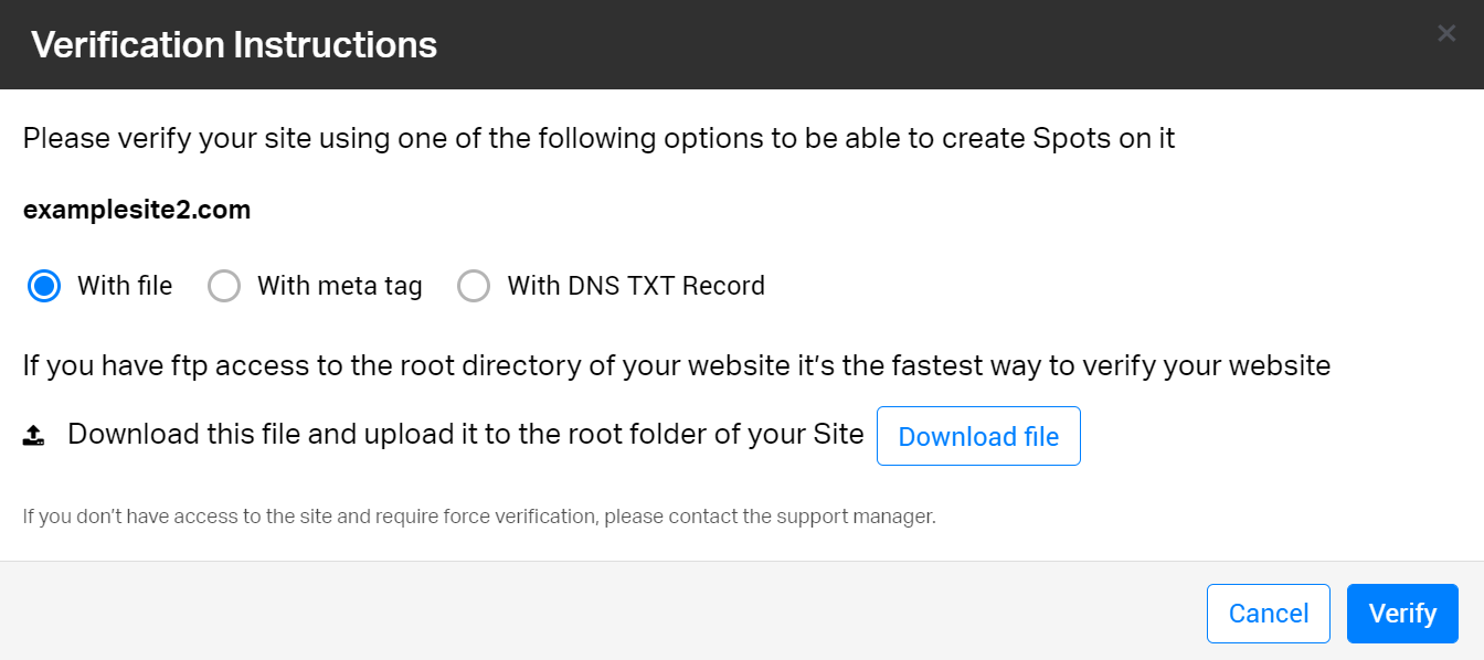 3. Выберите один из следующих вариантов, чтобы подтвердить свое право собственности на сайт: