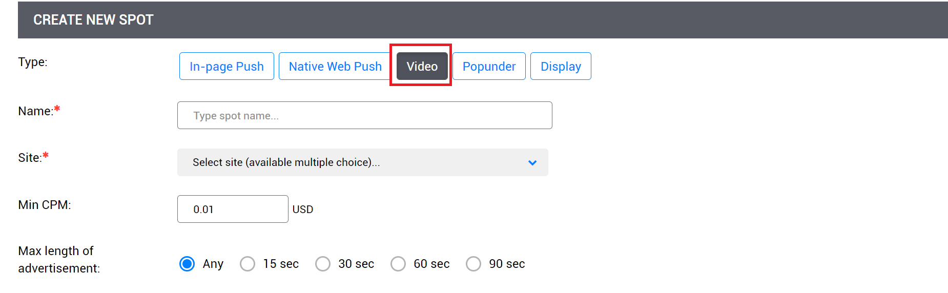 Перейдите на страницу Споты, нажмите кнопку «Добавить спот«.На новой странице выберите тип Video и настройки, которые посчитаете нужными.
